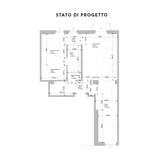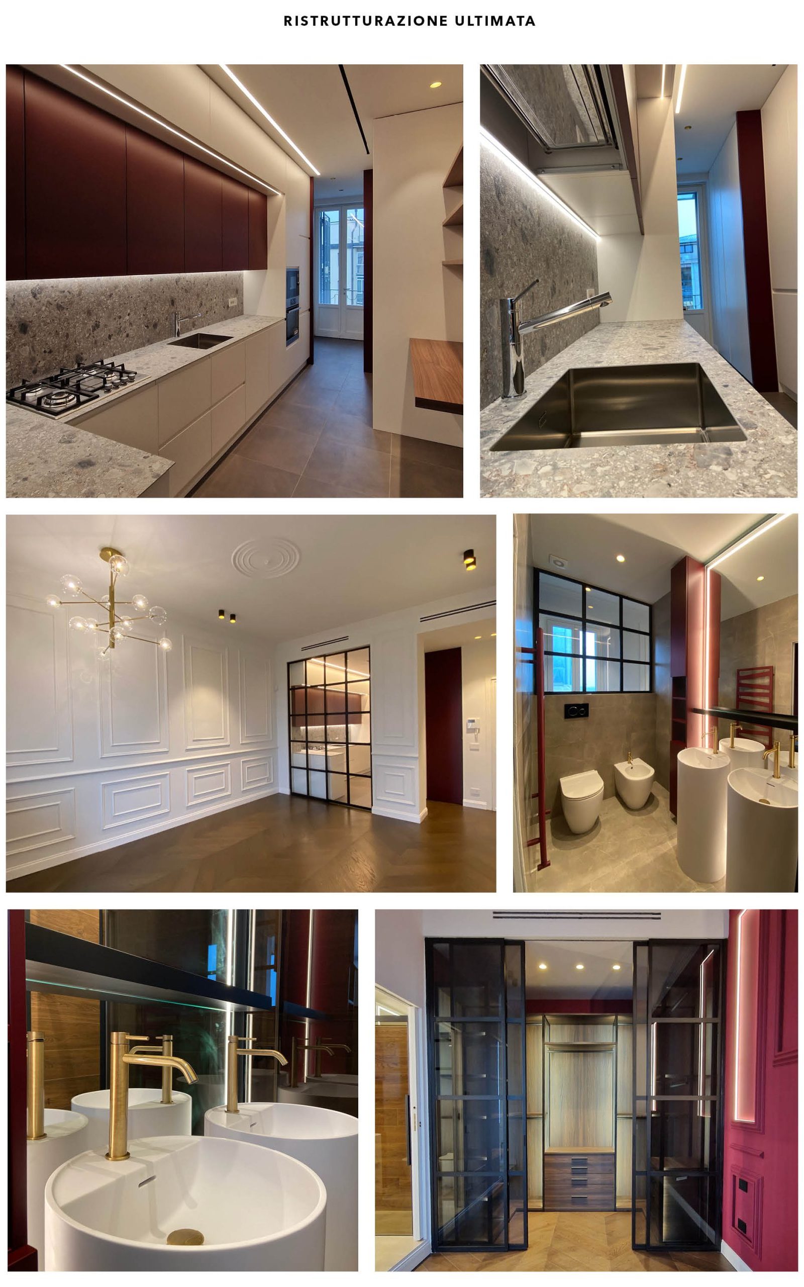 Ristrutturazione completa di un bilocale di 75mq a Milano. Il layout interno è stato completamente stravolto. L’ingresso della camera da letto è stato spostato per consentire l’inserimento di un ripostiglio e di una cabina armadio a servizio della stessa camera da letto. Il bagno principale è stato leggermente ridotto in grandezza per creare il passaggio alla camera da letto e per creare un secondo bagnetto ospiti. La parete tra soggiorno e cucina è stata eliminata e sostituita da pareti industriali in ferro e vetro, che danno maggiore ampiezza e luce a tutta la zona. Anche la cucina è stata ridotta leggermente in lunghezza per consentire la realizzazione di una lavanderia.